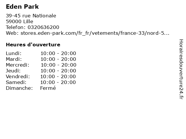 1 Eden Park (Distance: 0,82 km) 36 Centre commercial Euralille, 59000 Lille accessoires, eden, femme, homme, mode, park, vêtements 2 Eden Park (Distance: 4,86 km) 1E Rue de la Ladrié, 59290 Wasquehal accessoires, eden, femme, homme, mode, park, vêtements 3 Eden Park (Distance: 10,05 km) 3 Avenue de l'Épinette, 59113 Seclin accessoires, eden, femme, homme, mode, park, vêtements 4 Eden Park (Distance: 13,23 km) n/a ZAC du Petit Menin, 59960 Neuville en Ferrain accessoires, eden, femme, homme, mode, park, vêtements 5 Eden Park (Distance: 17,58 km) 17 Rue Edouard Plachez, 62220 Carvin accessoires, eden, femme, homme, mode, park, vêtements 6 Sorelli - Car Park (Distance: 0,16 km) . Place Rihour, 59800 Lille car, park, parking, services, sorelli |
