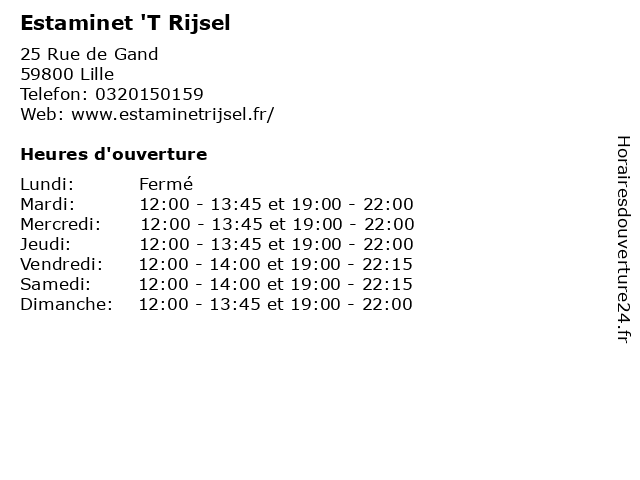 1 L’Estaminet Le Rijsel (Distance: 0,01 km) 25 rue de Gand, 59800 Lille bistrot, le, l’estaminet, restaurant, rijsel 2 L'Estaminet De Gand (Distance: 0,05 km) 50-52 Rue de Gand, 59800 Lille blb, de, estaminet, gand, l'estaminet, restaurants 3 Estaminet Du Welsh (Distance: 0,08 km) 45 Rue de Gand, 59800 Lille cuisine flamande, du, estaminet, restaurant, saumon, végétarien, welsh 4 Estaminet Chez La Vieille (Distance: 0,10 km) 60 rue de Gand, 59800 Lille bistrot, chez, estaminet, la, restaurant, vieille 5 Estaminet Chez La Vieille (Distance: 0,14 km) 60 Rue de Gand, 59000 Lille chez, estaminet, flamand, gratin, la, plats du nord, restaurant français, vieille 6 Estaminet des Trolls et Petits Lutins (Distance: 1,80 km) 30 rue Gosselet, 59000 Lille bistrot, des, estaminet, et, lutins, petits, restaurant, trolls |