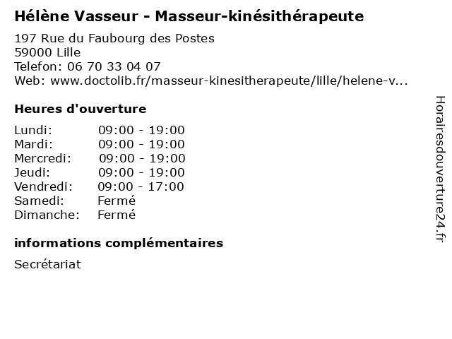 1 Dr Michèle Vasseur - Pharmacien hospitalier (Distance: 0,62 km) - Rue Philippe Marache, 59000 Lille cachet, centrale, dr, hospitalier, medicament, michèle, pharmacie, pharmacien, vasseur 2 Dr Hélène Verkindt - Chirurgien généraliste (Distance: 0,63 km) - Rue Michel Polonowski, 59037 Lille chirurgien, chiurgie, dr, general, généraliste, huriez, hélène, hôpital, soins, verkindt 3 Dr Hélène Meng - Anesthésiste réanimateur (Distance: 0,63 km) - Rue Michel Polonowski, 59037 Lille anesthésie, anesthésiste, anesthésistes, dr, huriez, hélène, hôpital, meng, réanimateur, réanimateurs 4 Maître Hélène Cappelaere - Avocate (Distance: 2,08 km) 27 Place du Maréchal Leclerc, 59000 Lille avocate, avocats, cappelaere, civils, droits, helene, hélène, juridiques, maître 5 Dr. Lampin Hélène - Psychologue (Distance: 2,47 km) 242 Rue Nationale, 59000 Lille docteur, dr., hélène, lampin, medecins, psychologue, sante 6 Dr Marie-Hélène Deschepper-Crinquette - Médecin du travail (Distance: 2,63 km) 118 Rue De Solferino, 59000 Lillle consultation, crinquette, deschepper, docteur, dr, du, helene, hélène, marie, med, médecin, traitement, travail |
