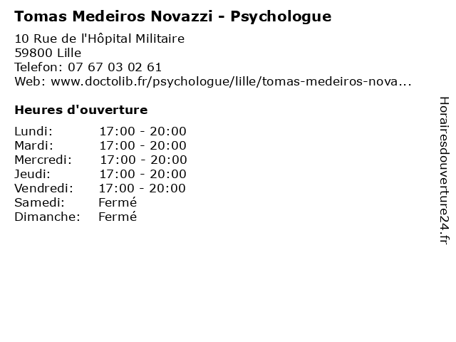 1 Dr Tomas Moraly - Allergologue (Distance: 1,84 km) - Boulevard de Belfort, 59000 Lille allergologue, consultation, docteur, dr, med, moraly, médecin, tomas, traitement 2 Sarah De Souza Medeiros (Distance: 12,01 km) 2 Rue de l'Abbé Guichard, 59126 Linselles de, medeiros, sarah, souza 3 Dr Tomas Moraly - Allergologue (Distance: 15,91 km) 21 Rue Chobourdin, 59134 Herlies allergologue, consultation, docteur, dr, med, moraly, médecin, tomas, traitement 4 Marine Miranda - Psychologue (Distance: 0,00 km) 10 Rue de l'Hôpital Militaire, 59800 Lille marine, miranda, psy, psychiatre, psychologue, sante, soins 5 Nagat Benneceur - Psychologue (Distance: 0,00 km) 10 Rue de l'Hôpital Militaire, 59800 Lille benneceur, folie, nagat, psychiatre, psychiatrie, psychiatrique, psychologue 6 Eugénie Guermonprez - Psychologue (Distance: 0,00 km) 10 Rue de l'Hôpital Militaire, 59800 Lille cabinets, eugénie, guermonprez, médecins, psychologue, secrétariat, thérapies |