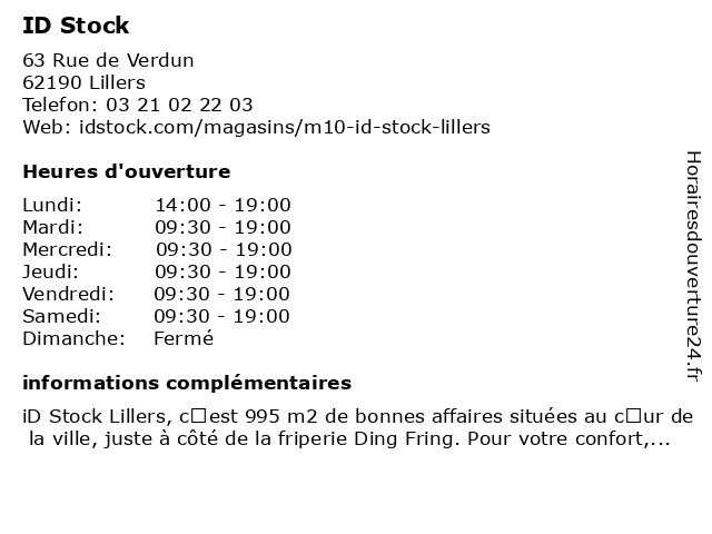 | 1 ID Stock (Distance: 9,67 km) - Rue de l'avenir, 62120 Aire-sur-la-Lys id, id stock, magasin. discount, stock, ultra 2 ID Stock (Distance: 10,00 km) 10 Rue des Frères Lumières, 62700 Bruay-la-Buissière id, id stock, magasin. discount, stock, ultra 3 ID Stock (Distance: 19,56 km) 30 Rue de Lille, 59940 Estaires id, id stock, magasin. discount, stock, ultra 4 ID Stock (Distance: 19,59 km) - Zone de la Creule, 59190 Hazebrouck id, id stock, magasin. discount, stock, ultra 6 Boulangerie-Pâtisserie ID Pain (Distance: 16,31 km) 143 Colonel Bento Roma, 62136 La Couture boulangerie, boutique, id, pain, pâtisserie, restauration |