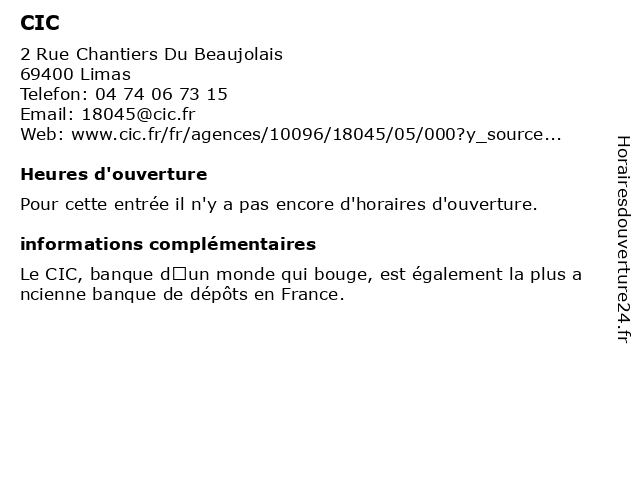 1 CIC (Distance: 0,00 km) 2 Rue Chantiers Du Beaujolais, 69400 Limas cic, compagnie de téléphone, organisme d'assurance 2 CIC (Distance: 0,01 km) 2 Rue Des Chantiers Du Beaujolais, 69400 Limas cic, compagnie de téléphone, organisme d'assurance 3 CIC (Distance: 3,11 km) 937 Rue Edouard Herriot, 01480 Jassans Riottier cic, compagnie de téléphone, organisme d'assurance 5 CIC (Distance: 6,33 km) 3 Boulevard Des Combattants, 01600 Trevoux cic, compagnie de téléphone, organisme d'assurance 6 CIC (Distance: 13,58 km) Les Arcades, 69380 Civrieux D Azergues cic, compagnie de téléphone, organisme d'assurance |