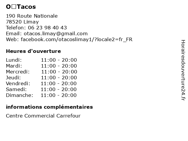 1 So'Tacos (Distance: 4,23 km) 34 Boulevard Roger salengro, 78711 Mantes-la-Ville bismillah, deli, food, restaurants, so'tacos 2 Food Station (Distance: 4,66 km) 82 Boulevard Roger Salengro, 78711 Mantes-la-Ville burgers, fastfood, food, restaurant, sandwich, snack, station, tacos 3 Food Station (Distance: 5,20 km) 21 allée des Médecins, 78200 Mantes-la-Jolie fastfood, food, pizzas, restaurants, station, tacos 4 Le Bon App (Distance: 22,23 km) 53 Rue de la Gare, 78370 Plaisir app, boissons, bon, dessert, le, paninis, pizzas, restaurant, tacos 5 O’Tacos (Distance: 24,27 km) 25 rue du Gros Caillou, 78340 Les Clayes Sous Bois boissons, nourriture, o’tacos, restaurant, service 6 O’Tacos (Distance: 31,10 km) 10 allée des Epices, 78180 Montigny le Bretonneux boissons, nourriture, o’tacos, restaurant, service |