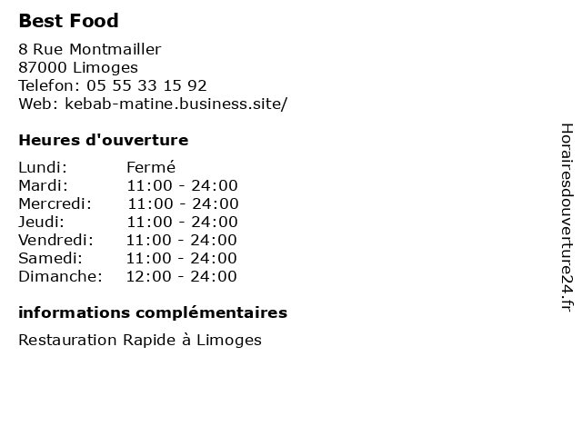 1 Best Food (Distance: 0,01 km) 8 Rue Montmailler, 87000 Limoges best, cuisine, food, kebab, matine, restaurants 2 The Food World (Distance: 0,01 km) 8 Rue Montmailler, 87000 Limoges apéritifs, boissons, food, the, world 4 Dubble Food (Distance: 0,34 km) 1 place d'Aine, 87000 Limoges bar, dubble, fast, food, rapide, restaurant, restauration, salades, sandwiches, soupes, vegan, vegetarien 5 BÒ Quality Fast Food (Distance: 0,43 km) 31 Rue Des Arènes, 87000 Limoges bar, bò, café, fabien, fast, food, limoges, quality, restaurants, senamaud 6 Big-Food Burger & Chicken (Distance: 1,81 km) 116 Avenue du Général Leclerc, 87100 Limoges big, burger, chicken, food, restaurants |