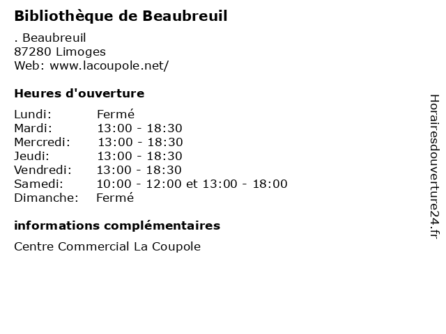 | Samedi | 10:00-12:00 et 13:00-18:00 |
