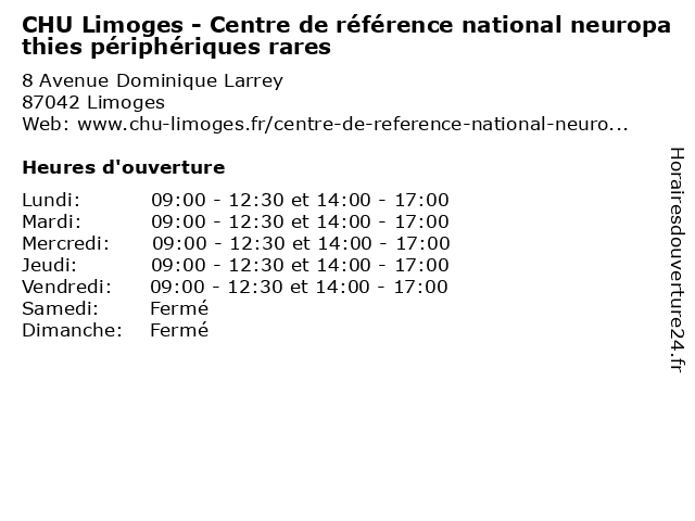 1 CHU Limoges - Centre de référence national neuropathies périphériques rares (Distance: 0,70 km) 2 Avenue Martin-Luther-King, 87042 Limoges bureau, centre, chu, consultation, de, dr, limoges, maladie, med, médecin, médecine, national, neuropathies, pratique, périphériques, rares, référence, thérapie, traitement 2 CHU Limoges - Centre de référence national neuropathies périphériques rares (Distance: 0,75 km) - Avenue du Buisson, 87042 Limoges bureau, centre, chu, consultation, de, dr, limoges, maladie, med, médecin, médecine, national, neuropathies, pratique, périphériques, rares, référence, thérapie, traitement 3 CHU Limoges - Centre de référence national neuropathies périphériques rares (Distance: 3,70 km) 2 Rue Henri De Bournazel, 87038 Limoges bureau, centre, chu, consultation, de, dr, limoges, maladie, med, médecin, médecine, national, neuropathies, pratique, périphériques, rares, référence, thérapie, traitement 4 CHU Limoges - Centre de référence national maladies rares du métabolisme phosphocalcique / Pr Lienhardt-Roussie (Distance: 0,00 km) 8 Avenue Dominique Larrey, 87042 Limoges bureau, centre, chu, consultation, de, dr, du, lienhardt, limoges, maladie, maladies, med, médecin, métabolisme, national, phosphocalcique, pr, rares, roussie, référence 5 CHU Limoges - Centre de référence national maladies rares du métabolisme phosphocalcique / Dr Cécile Etoubleau (Distance: 0,00 km) 8 Avenue Dominique Larrey, 87042 Limoges bureau, centre, chu, consultation, cécile, de, dr, du, etoubleau, limoges, maladie, maladies, med, médecin, médecine, métabolisme, national, phosphocalcique, rares, référence 6 CHU Limoges - Centre de référence national maladies rares du métabolisme phosphocalcique / Pr Lienhardt-Roussie (Distance: 0,70 km) 2 Avenue Martin-Luther-King, 87042 Limoges bureau, centre, chu, consultation, de, dr, du, lienhardt, limoges, maladie, maladies, med, médecin, métabolisme, national, phosphocalcique, pr, rares, roussie, référence |