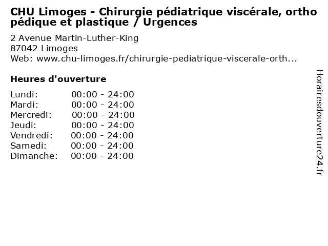 1 CHU Limoges - Chirurgie pédiatrique viscérale, orthopédique et plastique / Urgences (Distance: 0,54 km) - Avenue du Buisson, 87042 Limoges bureau, chirurgie, chu, consultation, dr, et, limoges, maladie, med, médecin, médecine, orthopédique, plastique, pratique, pédiatrique, thérapie, traitement, urgences, viscérale 2 CHU Limoges - Chirurgie pédiatrique viscérale, orthopédique et plastique / Urgences (Distance: 4,32 km) 2 Rue Henri De Bournazel, 87038 Limoges bureau, chirurgie, chu, consultation, dr, et, limoges, maladie, med, médecin, médecine, orthopédique, plastique, pratique, pédiatrique, thérapie, traitement, urgences, viscérale 3 CHU Limoges - Chirurgie pédiatrique viscérale, orthopédique et plastique (Distance: 0,00 km) 2 Avenue Martin-Luther-King, 87042 Limoges bureau, chirurgie, chu, consultation, dr, et, limoges, maladie, med, médecin, médecine, orthopédique, plastique, pratique, pédiatrique, thérapie, traitement, viscérale 4 CHU Limoges (Distance: 0,00 km) 2 Avenue Martin-Luther-King, 87042 Limoges bureau, chu, consultation, dr, limoges, maladie, med, médecin, médecine, pratique, thérapie, traitement 5 CHU Limoges - Anesthésie-réanimation / Secrétariat (Distance: 0,00 km) 2 Avenue Martin-Luther-King, 87042 Limoges anesthésie, bureau, chu, consultation, dr, limoges, maladie, med, médecin, médecine, pratique, réanimation, secrétariat, thérapie, traitement 6 CHU - Car Park (Distance: 0,40 km) . Docteur Raymond Marcland Street, 87000 Limoges automobile, car, chu, park, parking, services |