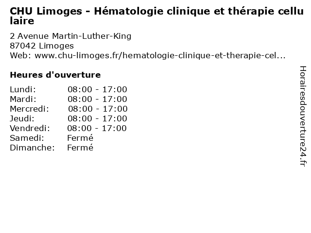 1 CHU Limoges - Hématologie clinique et thérapie cellulaire (Distance: 0,54 km) - Avenue du Buisson, 87042 Limoges bureau, cellulaire, chu, clinique, consultation, dr, et, hématologie, limoges, maladie, med, médecin, médecine, pratique, thérapie, traitement 2 CHU Limoges - Hématologie clinique et thérapie cellulaire (Distance: 0,70 km) 8 Avenue Dominique Larrey, 87042 Limoges bureau, cellulaire, chu, clinique, consultation, dr, et, hématologie, limoges, maladie, med, médecin, médecine, pratique, thérapie, traitement 3 CHU Limoges - Hématologie clinique et thérapie cellulaire (Distance: 4,32 km) 2 Rue Henri De Bournazel, 87038 Limoges bureau, cellulaire, chu, clinique, consultation, dr, et, hématologie, limoges, maladie, med, médecin, médecine, pratique, thérapie, traitement 4 CHU Limoges - Hématologie clinique et thérapie cellulaire / visites (Distance: 0,00 km) 2 Avenue Martin-Luther-King, 87042 Limoges bureau, cellulaire, chu, clinique, consultation, dr, et, hématologie, limoges, maladie, med, médecin, médecine, pratique, thérapie, traitement, visites 5 CHU Limoges (Distance: 0,00 km) 2 Avenue Martin-Luther-King, 87042 Limoges bureau, chu, consultation, dr, limoges, maladie, med, médecin, médecine, pratique, thérapie, traitement 6 CHU - Car Park (Distance: 0,40 km) . Docteur Raymond Marcland Street, 87000 Limoges automobile, car, chu, park, parking, services |