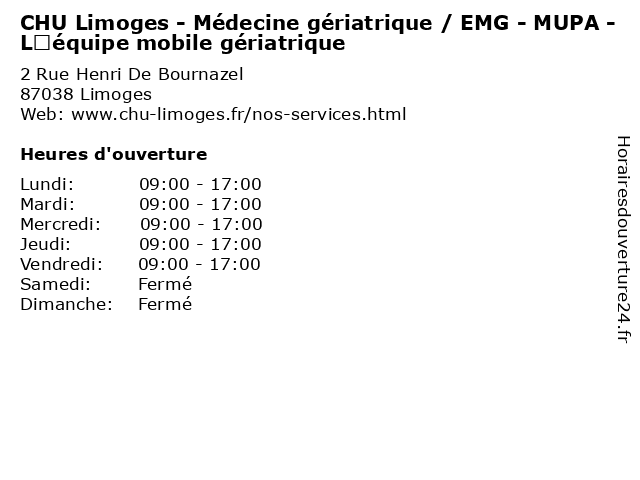 1 CHU Limoges - Médecine gériatrique / EMG - MUPA - L’équipe mobile gériatrique (Distance: 3,70 km) 8 Avenue Dominique Larrey, 87042 Limoges bureau, chu, consultation, dr, emg, gériatrique, limoges, l’équipe, maladie, med, mobile, mupa, médecin, médecine, pratique, thérapie, traitement 2 CHU Limoges - Médecine gériatrique / EMG - MUPA - L’équipe mobile gériatrique (Distance: 4,32 km) 2 Avenue Martin-Luther-King, 87042 Limoges bureau, chu, consultation, dr, emg, gériatrique, limoges, l’équipe, maladie, med, mobile, mupa, médecin, médecine, pratique, thérapie, traitement 3 CHU Limoges - Médecine gériatrique / EMG - MUPA - L’équipe mobile gériatrique (Distance: 4,44 km) - Avenue du Buisson, 87042 Limoges bureau, chu, consultation, dr, emg, gériatrique, limoges, l’équipe, maladie, med, mobile, mupa, médecin, médecine, pratique, thérapie, traitement 4 CHU Limoges - Centre de référence national neuropathies périphériques rares (Distance: 0,00 km) 2 Rue Henri De Bournazel, 87038 Limoges bureau, centre, chu, consultation, de, dr, limoges, maladie, med, médecin, médecine, national, neuropathies, pratique, périphériques, rares, référence, thérapie, traitement 5 CHU Limoges - Centre de prélèvement (Distance: 0,00 km) 2 Rue Henri De Bournazel, 87038 Limoges bureau, centre, chu, consultation, de, dr, limoges, maladie, med, médecin, médecine, pratique, prélèvement, thérapie, traitement 6 CHU Limoges - Cardiologie (Distance: 0,00 km) 2 Rue Henri De Bournazel, 87038 Limoges bureau, cardiologie, chu, consultation, dr, limoges, maladie, med, médecin, médecine, pratique, thérapie, traitement |