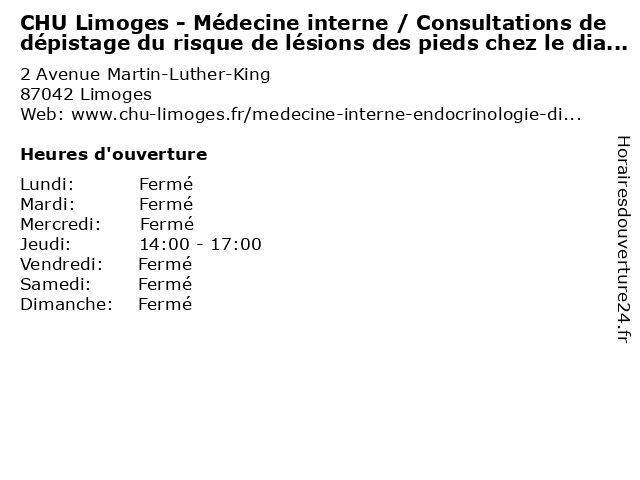 1 CHU Limoges - Médecine interne / Consultations de dépistage du risque de lésions des pieds chez le diabétique (Distance: 0,54 km) - Avenue du Buisson, 87042 Limoges bureau, chez, chu, consultation, consultations, de, des, diabétique, dr, du, dépistage, interne, le, limoges, lésions, maladie, med, médecine, pieds, risque 2 CHU Limoges - Médecine interne / Consultations de dépistage du risque de lésions des pieds chez le diabétique (Distance: 0,70 km) 8 Avenue Dominique Larrey, 87042 Limoges bureau, chez, chu, consultation, consultations, de, des, diabétique, dr, du, dépistage, interne, le, limoges, lésions, maladie, med, médecine, pieds, risque 3 CHU Limoges - Médecine interne / Consultations de dépistage du risque de lésions des pieds chez le diabétique (Distance: 4,32 km) 2 Rue Henri De Bournazel, 87038 Limoges bureau, chez, chu, consultation, consultations, de, des, diabétique, dr, du, dépistage, interne, le, limoges, lésions, maladie, med, médecine, pieds, risque 4 CHU Limoges - Centre Gratuit d’Information et de Dépistage - CeGIDD (Distance: 0,00 km) 2 Avenue Martin-Luther-King, 87042 Limoges bureau, cegidd, centre, chu, consultation, de, dr, d’information, dépistage, et, gratuit, limoges, maladie, med, médecin, médecine, pratique, thérapie, traitement 5 CHU Limoges - Médecine interne (Distance: 0,00 km) 2 Avenue Martin-Luther-King, 87042 Limoges bureau, chu, consultation, dr, interne, limoges, maladie, med, médecin, médecine, pratique, thérapie, traitement 6 CHU Limoges - Médecine interne / Hospitalisation de semaine (HDS) 2ème Niveau (Distance: 0,00 km) 2 Avenue Martin-Luther-King, 87042 Limoges 2ème, bureau, chu, consultation, de, dr, hds, hospitalisation, interne, limoges, maladie, med, médecin, médecine, niveau, pratique, semaine, thérapie, traitement |