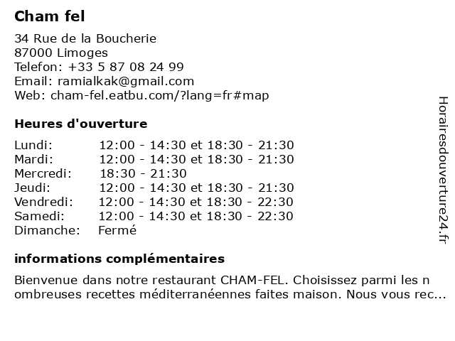 | Samedi | 12:00-14:30 et 18:30-22:30 |