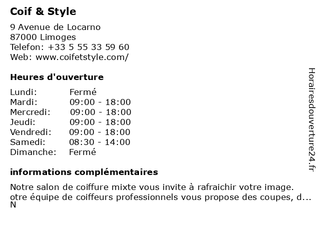 2 LD Sport et Style (Distance: 0,90 km) 28 Rue du Temple, 87000 Limoges accessoires, divers, et, habillement, ld, magasins, sport, style 3 5 Nuance Coiffure et Style (Distance: 3,00 km) 4 place commerce, 87350 Panazol cheveux, coiffeur, coiffure, et, nuance, style 6 |