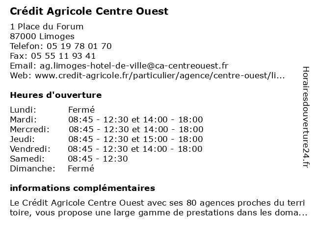 1 Crédit Agricole Centre Ouest (Distance: 0,31 km) 24 Rue Jean Jaurès, 87000 Limoges agricole, centre, crédit, ouest 2 Crédit Agricole Centre Ouest (Distance: 0,69 km) 50 Avenue de la Libération, 87000 Limoges agricole, centre, crédit, ouest 3 Crédit Agricole Centre Ouest (Distance: 0,86 km) 13 Place des Carmes, 87000 Limoges agricole, centre, crédit, ouest 4 Crédit Agricole Centre Ouest (Distance: 1,11 km) 105 Rue de Babylone, 87000 Limoges agricole, centre, crédit, ouest 5 Crédit Agricole Centre Ouest (Distance: 1,32 km) 3 Pl. Sadi Carnot, 87100 Limoges agricole, centre, crédit, ouest 6 Crédit Agricole Centre Ouest (Distance: 3,89 km) 1 Rue Jean Jaurès, 87170 Isle agricole, centre, crédit, ouest |