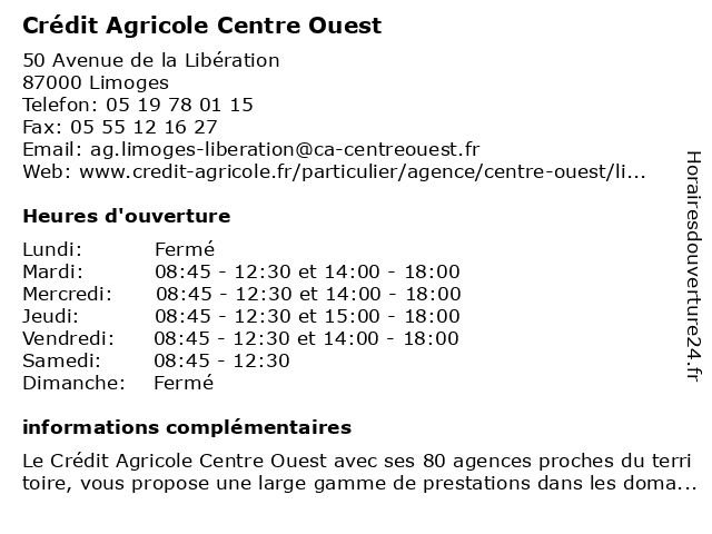 1 Crédit Agricole Centre Ouest (Distance: 0,39 km) 24 Rue Jean Jaurès, 87000 Limoges agricole, centre, crédit, ouest 2 Crédit Agricole Centre Ouest (Distance: 0,66 km) 3 Pl. Sadi Carnot, 87100 Limoges agricole, centre, crédit, ouest 3 Crédit Agricole Centre Ouest (Distance: 0,67 km) 13 Place des Carmes, 87000 Limoges agricole, centre, crédit, ouest 4 Crédit Agricole Centre Ouest (Distance: 0,69 km) 1 Place du Forum, 87000 Limoges agricole, centre, crédit, ouest 5 Crédit Agricole Centre Ouest (Distance: 1,41 km) 43 Avenue des Casseaux, 87000 Limoges agricole, centre, crédit, ouest 6 Crédit Agricole Centre Ouest (Distance: 1,77 km) 105 Rue de Babylone, 87000 Limoges agricole, centre, crédit, ouest |