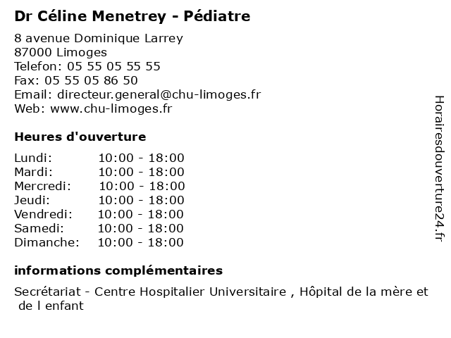 1 Dr Antoine Bedu - Pédiatre (Distance: 0,00 km) 8 avenue Dominique Larrey, 87000 Limoges antoine, bedu, consultation, docteur, dr, med, médecin, pédiatre, traitement 2 Dr Céline Kennel - Hématologue (Distance: 0,71 km) 2 avenue Martin Luther King, 87000 Limoges celine, consultation, céline, docteur, dr, hématologue, kennel, med, médecin, traitement 3 Dr Céline Quintard-Lacour - Néphrologue (Distance: 0,71 km) 2 avenue Martin Luther King, 87000 Limoges celine, consultation, céline, docteur, dr, lacour, med, médecin, néphrologue, quintard, traitement 4 Dr Jamal Abdennassar Aissaoui - Pédiatre - secrétariat (Distance: 1,22 km) 1 Rue Victor Schoelcher, 87000 Limoges abdennassar, aissaoui, dr, jamal, médecins, médicaments, pédiatre, santé, secrétariat, spécialiste 5 Dr Anahit Babakhanyan - Pédiatre (Distance: 1,22 km) 1 Rue Victor Schoelcher, 87000 Limoges anahit, babakhanyan, consultation, docteur, dr, med, médecin, médecine, pédiatre, traitement 6 Dr Gabriella Hiriscau - Pédiatre (Distance: 1,22 km) 1 Rue Victor Schoelcher, 87000 Limoges consultation, docteur, dr, gabriella, hiriscau, med, médecin, médecine, pédiatre, traitement |
