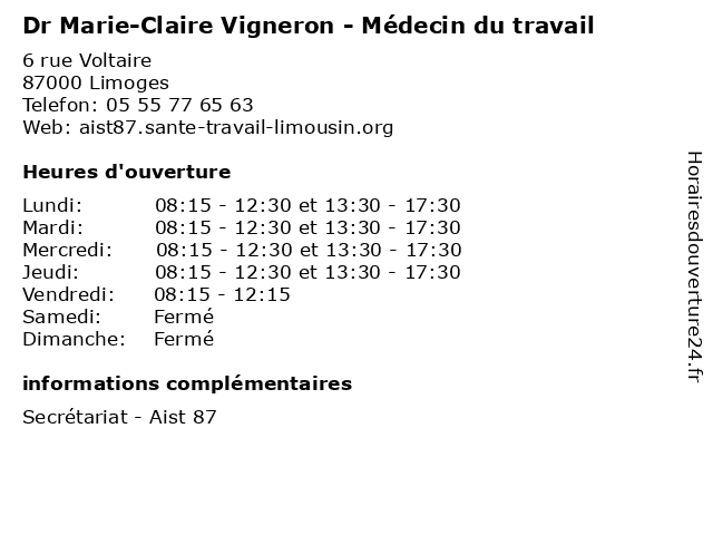 1 Dr Véronique Auzemery - Médecin du travail (Distance: 0,00 km) 6 rue Voltaire, 87000 Limoges auzemery, consultation, docteur, dr, du, med, médecin, traitement, travail, veronique, véronique 2 Dr Pascale Brachet - Médecin du travail (Distance: 0,00 km) 6 rue Voltaire, 87000 Limoges brachet, consultation, docteur, dr, du, med, médecin, pascale, traitement, travail 3 Dr Martine Castillon-Bontemps - Médecin du travail (Distance: 0,00 km) 6 rue Voltaire, 87000 Limoges bontemps, castillon, consultation, docteur, dr, du, martine, med, médecin, traitement, travail 4 Dr Christine Degrassat - Médecin du travail (Distance: 0,00 km) 6 rue Voltaire, 87000 Limoges christine, consultation, degrassat, docteur, dr, du, med, médecin, traitement, travail 5 Dr Françoise Deltreil - Médecin du travail (Distance: 0,00 km) 6 rue Voltaire, 87000 Limoges consultation, deltreil, docteur, dr, du, francoise, françoise, med, médecin, traitement, travail 6 AIST87 - Santé au Travail (Distance: 0,01 km) 6 Rue Voltaire, 87054 Limoges aist87, au, centre, famille, médical, santé, travail |