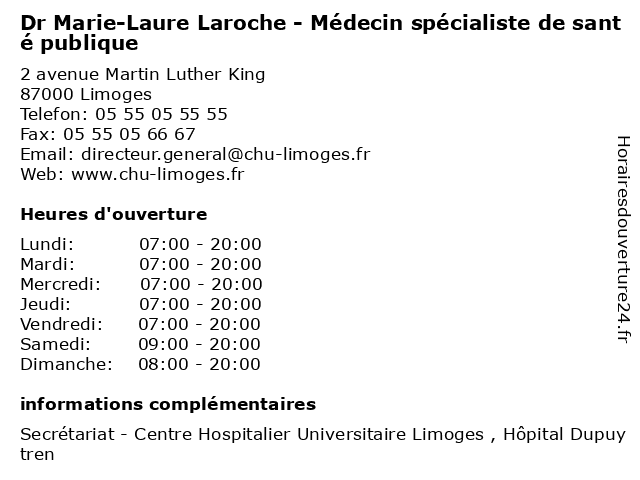 1 Dr Anne-Laure Fauchais - Spécialiste en médecine interne (Distance: 0,00 km) 2 avenue Martin Luther King, 87000 Limoges anne, consultation, docteur, dr, en, fauchais, interne, laure, med, médecin, médecine, spécialiste, traitement 2 Dr Marie-Laure Darde - Dermatologue et vénérologue (Distance: 0,00 km) 2 avenue Martin Luther King, 87000 Limoges consultation, darde, dermatologue, docteur, dr, et, laure, marie, med, médecin, traitement, vénérologue 3 Anne-Laure Peyne - Masseur-kinésithérapeute (Distance: 0,00 km) 2 avenue Martin Luther King, 87000 Limoges anne, consultation, docteur, dr, kinésithérapeute, laure, masseur, med, médecin, peyne, traitement 4 Dr Laure Ponthier - Pédiatre (Distance: 0,71 km) 8 avenue Dominique Larrey, 87000 Limoges consultation, docteur, dr, laure, med, médecin, ponthier, pédiatre, traitement 5 Maître Marie-Laure Senamaud - Avocate (Distance: 2,57 km) 2 rue Brousseau, 87000 Limoges avocate, avocats, civils, droits, juridiques, laure, marie, maître, senamaud 6 Christine Laure (Distance: 3,03 km) 39 Avenue Garibaldi, 87100 Limoges accessoires, christine, habillement, laure, mode, pret a porter, vetements |