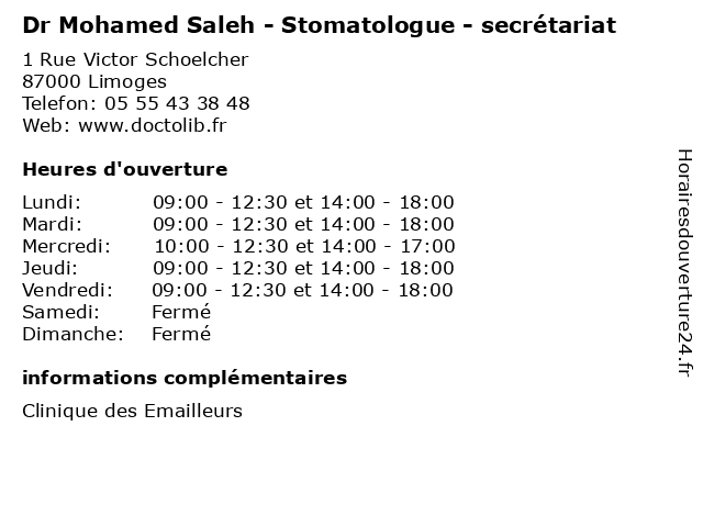 1 Dr Marc Lafleur - Stomatologue (Distance: 0,00 km) 1 Rue Victor Schoelcher, 87000 Limoges consultation, docteur, dr, lafleur, marc, med, médecin, stomatologue, traitement 2 Dr Philippe Penelaud - Chirurgien maxillo-facial et stomatologue (Distance: 0,00 km) 1 Rue Victor Schoelcher, 87000 Limoges chirurgien, consultation, docteur, dr, et, facial, maxillo, med, médecin, penelaud, philippe, stomatologue, traitement 3 Dr Mohamed Khalil - Neurologue (Distance: 0,51 km) 2 avenue Martin Luther King, 87000 Limoges consultation, docteur, dr, khalil, med, mohamed, médecin, neurologue, traitement 4 Dr Mohamed Touati - Médecin généraliste (Distance: 0,51 km) 2 avenue Martin Luther King, 87000 Limoges consultation, docteur, dr, généraliste, med, mohamed, médecin, touati, traitement 6 Dr Mohamed Taher Sefiani - Anesthésiste (Distance: 26,71 km) 12 Chateaubriand, 87200 Saint-Junien anesthésiste, consultation, docteur, dr, med, mohamed, médecin, sefiani, taher, traitement  |