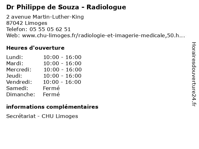 1 Dr Philippe Bouillet - Radiologue (Distance: 0,00 km) 2 avenue Martin-Luther-King, 87042 Limoges bouillet, consultation, docteur, dr, med, médecin, médecine, philippe, radiologue, traitement 2 Dr Jean-Philippe Rerolle - Néphrologue (Distance: 0,00 km) 2 avenue Martin Luther King, 87000 Limoges consultation, docteur, dr, jean, med, médecin, néphrologue, philippe, rerolle, traitement 3 Philippe Dalpin-Louis - Masseur-kinésithérapeute (Distance: 0,00 km) 2 avenue Martin Luther King, 87000 Limoges consultation, dalpin, docteur, dr, kinésithérapeute, louis, masseur, med, médecin, philippe, traitement 4 Dr Philippe Couratier - Psychiatre (Distance: 0,00 km) 2 avenue Martin Luther King, 87000 Limoges consultation, couratier, docteur, dr, med, médecin, philippe, psychiatre, traitement 5 Dr Philippe Bertin - Rhumatologue (Distance: 0,00 km) 2 avenue Martin Luther King, 87000 Limoges bertin, consultation, docteur, dr, med, médecin, philippe, rhumatologue, traitement 6 Dr Philippe Brosset - Pédiatre (Distance: 0,71 km) 8 avenue Dominique Larrey, 87000 Limoges brosset, consultation, docteur, dr, med, médecin, philippe, pédiatre, traitement |