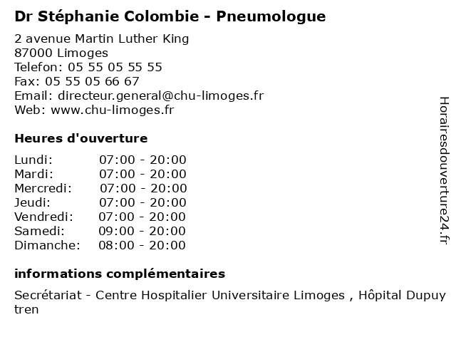 1 Dr Stéphanie Sebban - Médecin généraliste (Distance: 0,00 km) 2 avenue Martin Luther King, 87000 Limoges consultation, docteur, dr, généraliste, med, médecin, sebban, stephanie, stéphanie, traitement 2 Dr Francois Touraine - Pneumologue (Distance: 0,00 km) 2 Avenue Martin Luther King, 87100 Limoges dr, francois, médecins, médicaments, pneumologue, santé, secrétariat, spécialiste, touraine 3 Dr Bernard Demonet - Pneumologue (Distance: 0,00 km) 2 avenue Martin Luther King, 87000 Limoges bernard, consultation, demonet, docteur, dr, med, médecin, pneumologue, traitement 4 Dr Magali Dupuy-Grasset - Pneumologue (Distance: 0,00 km) 2 avenue Martin Luther King, 87000 Limoges consultation, docteur, dr, dupuy, grasset, magali, med, médecin, pneumologue, traitement 5 Dr Bernard Eichler - Pneumologue (Distance: 0,00 km) 2 avenue Martin Luther King, 87000 Limoges bernard, consultation, docteur, dr, eichler, med, médecin, pneumologue, traitement 6 Dr Florent Favard - Pneumologue (Distance: 0,00 km) 2 avenue Martin Luther King, 87000 Limoges consultation, docteur, dr, favard, florent, med, médecin, pneumologue, traitement |
