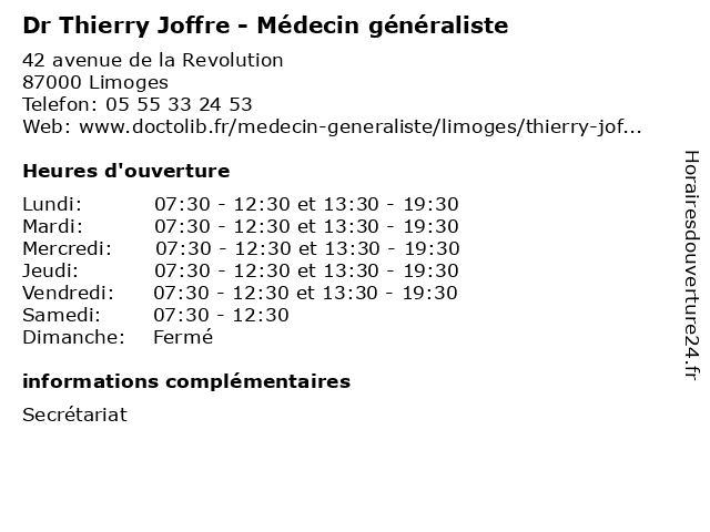 | Lundi | 07:30-12:30 et 13:30-19:30 |