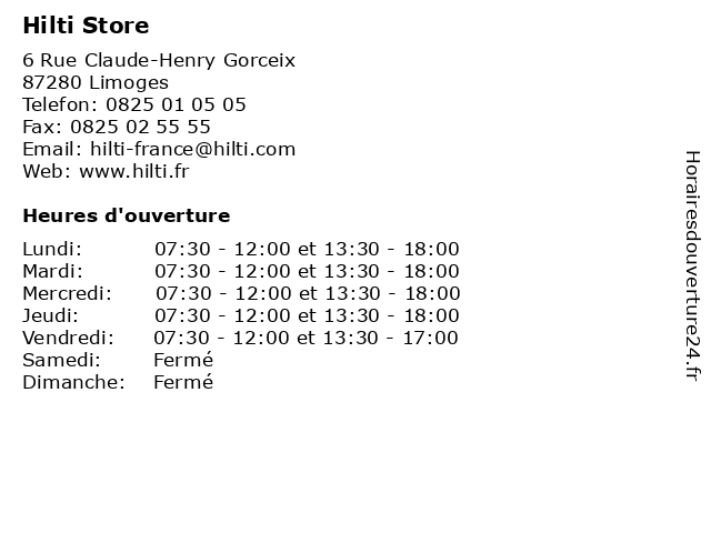 1 Hilti Store (service clients) (Distance: 0,00 km) 6 Rue Claude-Henry Gorceix, 87280 Limoges clients, equipements, hilti, machinerie, service, store 2 KLO - Discount Store (Distance: 0,29 km) 1 Rue Léon Serpollet, 87280 Limoges alimentation, braderie, destockeur, discount, hygiène, klo, limoges, store 3 Dokteur Store (Distance: 1,71 km) 16 Rue Pierre Michaux, 87280 Limoges dokteur, pergolas, réparation, store, volets 4 Monsieur Store (Distance: 1,71 km) 16 rue Pierre Michaux, 87020 Limoges fenetres, monsieur, pergolas, portails, portes, portes de garage, store, volets 5 Hugo Boss Store - Chaussures & Accessoires (Distance: 6,07 km) 6 Rue Porte Tourny, 87011 Limoges accessoires, boss, chaussures, hugo, mode, store, vêtements 6 Tui Store (Distance: 6,13 km) 1 rue Adrien Dubouché, 87280 Limoges croisieres, hotels, store, séjours, tui, vacances, vols |