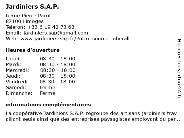 | 1 Jardiniers SAP Feytiat (Distance: 7,59 km) 3 Square du 19 Mars 1962, 87220 Feytiat feytiat, jardiniers, sap 2 Jardiniers SAP St Leonard De Noblat (Distance: 15,90 km) 14 Rue Jean Louis Gagnant, 87400 Saint-Léonard-de-Noblat de, jardiniers, leonard, noblat, sap, st 4 Jardiniers SAP St Moreil (Distance: 31,87 km) 9 Chemin du Rocher, 23400 Saint-Moreil jardiniers, moreil, sap, st 6 |