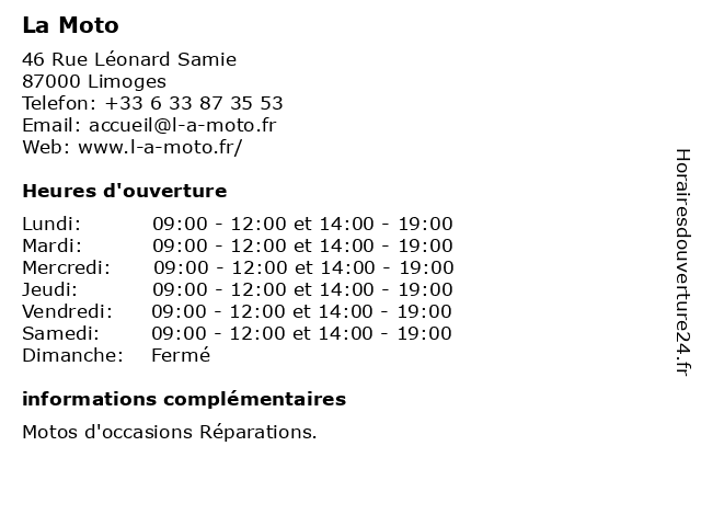 2 Moto Tacot (Distance: 1,90 km) 17 rue Georges Guynemer, 87220 Feytiat moto, moto tacot, outillage, pieces, reparations, services, tacot 4 Moto Move (Distance: 9,70 km) 9 Rue Pierre de Fermat, 87280 Limoges accessoire, moto, motos, move, vente, équipement 5 Metéore Moto (Distance: 9,90 km) 32 Route de Poitiers, 87270 Couzeix aixam, meteore, metéore, moto, motos, permis, réparation, sans, vente, voiture 6 |
