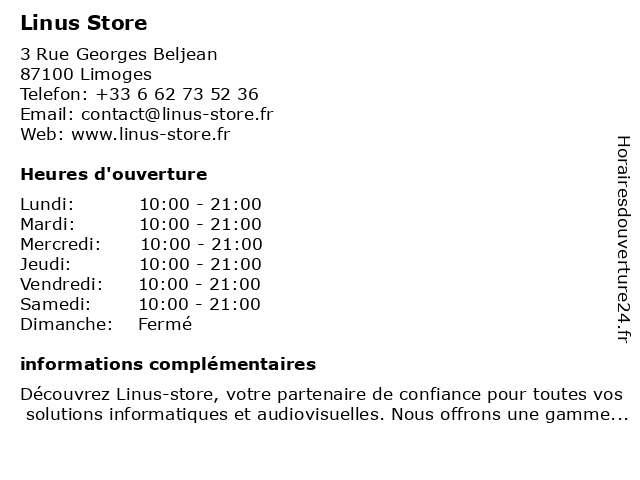 | Samedi | 10:00-21:00 |