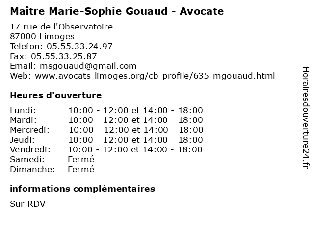 1 Maître Sophie Menu - Avocate (Distance: 0,37 km) 2 rue de l'Amphithéâtre, 87000 Limoges avocate, avocats, civils, droits, juridiques, maître, menu, sophie 2 Maître Sophie Charbonnier - Avocate (Distance: 0,41 km) 11ter rue Pétiniaud-Beaupeyrat, 87000 Limoges avocate, avocats, charbonnier, civils, droits, juridiques, maître, sophie 3 Maître Sophie Pelisson-Piperaud - Avocate (Distance: 0,50 km) 11ter rue Pétiniaud-Beaupeyrat, 87000 Limoges avocate, avocats, civils, droits, juridiques, maître, pelisson, piperaud, sophie 4 Anne-Sophie Biojoux-Kirschleger - Orthoptiste (Distance: 0,58 km) 9-11 Boulevard Victor Hugo, 87000 Limoges anne, biojoux, kirschleger, orthopedie, orthoptiste, orthopédique, sophie, trauma, traumatologie, traumatologique 5 Dr. Manigault Sophie - Dentiste (Distance: 0,60 km) 27 Boulevard Gambetta, 87000 Limoges dentiste, docteur, dr., manigault, medecins, sante, sophie 6 Maître Anne-Sophie Turpin - Avocate (Distance: 0,60 km) 14 rue Bernard Palissy, 87000 Limoges anne, avocate, avocats, civils, droits, juridiques, maître, sophie, turpin |