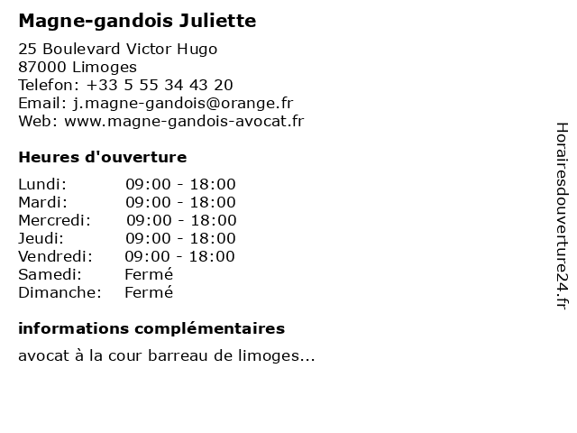 2 Maître Juliette Magne-Gandois - Avocate (Distance: 0,21 km) 25 boulevard Victor Hugo, 87000 Limoges avocate, avocats, civils, droits, gandois, juliette, juridiques, magne, maître 3 Gandois Maurette Isabelle (Distance: 0,53 km) 1 Rue du Général Cerez, 87000 Limoges gandois, isabelle, maurette 4 Dr Juliette Todeschi - Pédiatre (Distance: 17,61 km) 17 Rue Louis Jouvet, 87800 Nexon dr, enfant, juliette, medecin, pediatre, pédiatre, soins, todeschi |