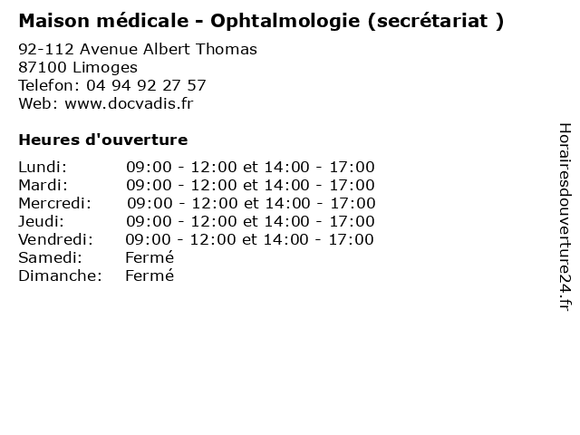 1 La Médicale (Distance: 2,00 km) 42 Avenue des Bénédictins, 87000 Limoges assurance vie, assurances, la, médicale, services 2 CHU Limoges - Ophtalmologie (Distance: 2,69 km) 8 Avenue Dominique Larrey, 87042 Limoges bureau, chu, consultation, dr, limoges, maladie, med, médecin, médecine, ophtalmologie, pratique, thérapie, traitement 3 Dr. Jean-paul Adenis- Ophtalmologie (Distance: 2,74 km) 2 , avenue Martin Luther King, 87042 Limoges adenis, consultation, docteur, dr., jean, ophtalmologie, paul, santé 4 CHU Limoges - Ophtalmologie (Distance: 2,74 km) 2 Avenue Martin-Luther-King, 87042 Limoges bureau, chu, consultation, dr, limoges, maladie, med, médecin, médecine, ophtalmologie, pratique, thérapie, traitement 5 CHU Limoges - Ophtalmologie (Distance: 3,22 km) - Avenue du Buisson, 87042 Limoges bureau, chu, consultation, dr, limoges, maladie, med, médecin, médecine, ophtalmologie, pratique, thérapie, traitement 6 CHU Limoges - Ophtalmologie (Distance: 3,49 km) 2 Rue Henri De Bournazel, 87038 Limoges bureau, chu, consultation, dr, limoges, maladie, med, médecin, médecine, ophtalmologie, pratique, thérapie, traitement |