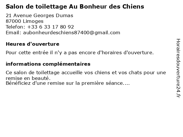 | Appeler Salon de toilettage Au Bonheur des Chiens | |