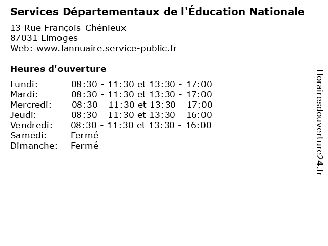| Mardi | 08:30-11:30 et 13:30-17:00 |