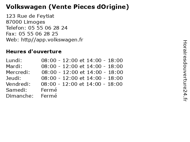 1 Volkswagen (Vente Pieces dOrigine) (Distance: 7,75 km) 1 Rue Edouard Goursat, 87000 Limoges automobiles, concessionnaire, dorigine, garage, motos, pieces, vente, volkswagen 2 Volkswagen (Atelier Mécanique) (Distance: 0,00 km) 123 Rue de Feytiat, 87000 Limoges atelier, automobiles, concessionnaire, garage, motos, mécanique, volkswagen 3 Volkswagen (Ventes Accessoires dOrigine) (Distance: 0,00 km) 123 Rue de Feytiat, 87000 Limoges accessoires, automobiles, concessionnaire, dorigine, garage, motos, ventes, volkswagen 4 Volkswagen (Financements VN VO) (Distance: 0,00 km) 123 Rue de Feytiat, 87000 Limoges automobiles, concessionnaire, financements, garage, motos, vn, vo, volkswagen 5 Volkswagen (Service Mobilite) (Distance: 0,00 km) 123 Rue de Feytiat, 87000 Limoges automobiles, concessionnaire, garage, mobilite, motos, service, volkswagen 6 Volkswagen (Assistance Dépannage) (Distance: 0,00 km) 123 Rue de Feytiat, 87000 Limoges assistance, automobiles, concessionnaire, dépannage, garage, motos, volkswagen |