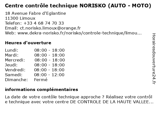 1 Centre contrôle technique AUTOCONTROL - Limoux (Distance: 1,24 km) 5 Avenue Camille Bouche, 11300 Limoux 4x4, autocontrol, camping car, centre, collection, contrôle, diesel, electrique, essence, gazole, limoux, suv, technique, utilitaire, voiture 2 Auto Securitas - Patrice Roux Contrôle Technique (Distance: 12,46 km) - Zone Industrielle Pastabrac, 11190 Couiza auto, contrôle, examen, patrice, roux, securitas, technique, visite, véhicule 3 Centre contrôle technique DEKRA (AUTO - MOTO) (Distance: 18,54 km) 665 Rue Paul Henri Mouton, 11000 Carcassonne 4x4, auto, camping car, centre, collection, contrôle, dekra, diesel, electrique, essence, gazole, moto, quad, scooter, suv, technique, utilitaire, voiture, vsp 4 DEKRA Contrôle technique automobile (Distance: 18,54 km) 665 Rue Paul Henri Mouton, 11000 Carcassonne automobile, contrôle, dekra, technique 5 DEKRA Contrôle technique automobile (Distance: 18,54 km) 665 Rue Paul Henri Mouton, 11000 Carcassonne automobile, contrôle, dekra, technique 6 Controle Technique De La Bouriette (Distance: 19,65 km) Boulevard Louis Joseph Gay Lussac, 11000 Carcassonne bouriette, controle, de, la, technique |