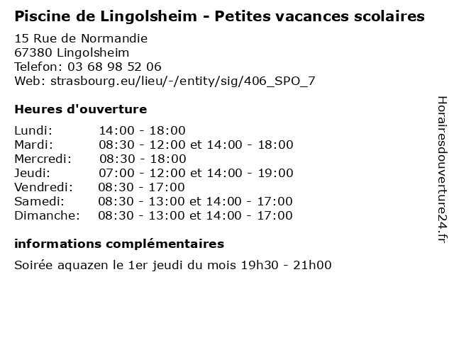 1 Piscine de Lingolsheim - Périodes scolaires (Distance: 0,00 km) 15 Rue de Normandie, 67380 Lingolsheim activité, bassins, de, famille, lingolsheim, natation, piscine, périodes, scolaires, sport 2 Piscine de Lingolsheim - Vacances d'été (Distance: 0,00 km) 15 Rue de Normandie, 67380 Lingolsheim activité, bassins, d'été, de, famille, lingolsheim, natation, piscine, sport, vacances 3 Plumy Park - Périodes Scolaires (Distance: 3,42 km) 2 rue Alexandre Dumas, 67200 Strasbourg enfants, jeux, parc de jeux couverts, park, plumy, période, périodes, scolaire, scolaires, sorties, toboggan géants 4 Piscine de Hautepierre - Périodes scolaires - bassin intérieur (Distance: 3,93 km) - Rue Baden-Powell, 67200 Strasbourg activité, bassin, bassins, de, famille, hautepierre, intérieur, natation, piscine, périodes, scolaires, sport 5 Piscine de la Kibitzenau - Périodes scolaires (Distance: 6,07 km) 1 Rue de la Kibitzenau, 67100 Strasbourg activité, bassins, de, famille, kibitzenau, la, natation, piscine, périodes, scolaires, sport 6 Bains municipaux - bains romains - Période scolaire/petites vacances scolaires (hommes) (Distance: 6,24 km) 10 Boulevard de la Victoire, 67000 Strasbourg bain, bains, hommes, l'eau, l'été, la natation, le plaisir, le soleil, municipaux, piscine, période, romains, scolaire/petites, scolaires, vacances |