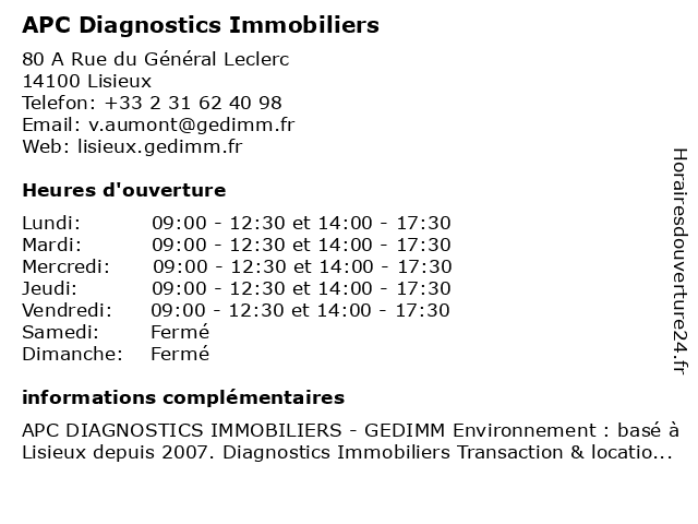 1 Agenda Diagnostics (Distance: 2,02 km) 178 Chemin de la Thillaye, 14100 Lisieux agenda, diagnostic, diagnostics, gaz, immobilier 2 ADN IMMOBILIER - AGENCE DIAGNOSTICS NORMANDIE IMMOBILIER (Distance: 29,04 km) 4 Avenue de la Mer, 14390 Cabourg adn, agence, diagnostics, immobilier, normandie 4 EX'IM LE HAVRE (Distance: 37,99 km) 32 Place du Vieux Marché, 76600 Le Havre diagnostic location, diagnostic vente, diagnostics immobilier, dpe, ex'im, havre, le, légionelle, qualité d'air intérieur 5 Juris Diagnostics Immobiliers (Distance: 39,26 km) 7 Place Alphonse Martin, 76600 Le Havre diagnostics, immobiliers, juris 6 BC2E Diagnostics Immobiliers (Distance: 44,43 km) 5 résidence l'Orée d'Hastings, 14000 Caen bc2e, diagnostic, diagnostics, expertise, immobilier, immobiliers |