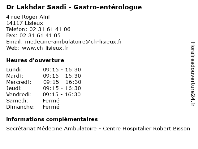 Termes de recherche pour Dr Lakhdar Saadi - Gastro-entérologue:robert, lisieux, centre, soins, hospitalier, bisson, dr, chirurgien, gastro, entérologue, ambulatoire, lakhdar, saadi, chiurgie |