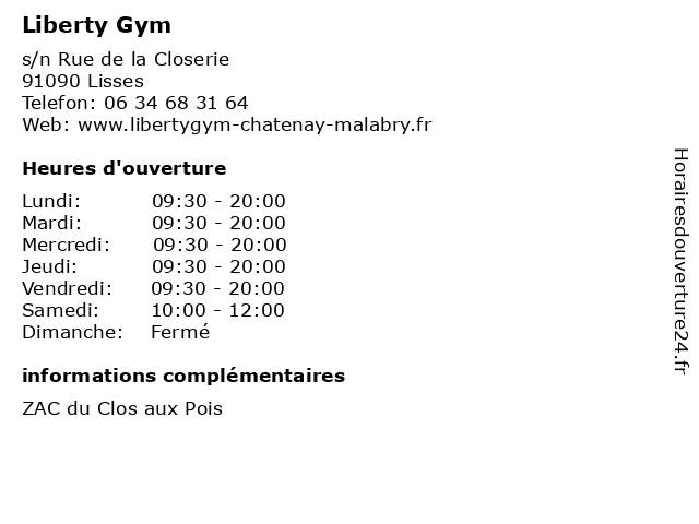 1 Liberty Gym (Distance: 16,96 km) 3 Rue Galilée, 77170 Brie comte robert gym, l'exercice, liberty, machines cardio 2 Liberty Gym (Distance: 18,71 km) 3 rue de la Résistance, 94324 Thiais cardio, de, fitness, gym, horaires, liberty, musculation, permanence 3 Liberty Gym (Accès Club) (Distance: 0,00 km) s/n Rue de la Closerie, 91090 Lisses acces, accès, cardio, club, fitness, gym, liberty, musculation 4 Auto Ecole Liberty (Distance: 8,91 km) 53 Voie de Compiègne, 91390 Morsang-sur-Orge auto, ecole, liberty 5 Gym Suedoise - Massy Parc Georges Brassens (Distance: 18,55 km) - Avenue du Maréchal Koenig, 91300 Massy brassens, centre, club, cours, georges, gym, l'exercice, la santé, le sport, les muscles, levallois, massy, parc, seniors, sporting, stretch, suedoise, yoga&gym 6 Liberty Gym (Accès Club) (Distance: 18,57 km) 3 Rue de la Résistance, 94324 Thiais accès, club, fitness, gym, liberty, musculation, salle de sport, sport |