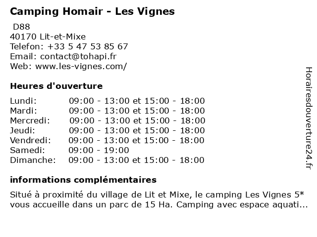 1 Camping Les Vignes - Tohapi (Réception, haute saison) (Distance: 0,14 km) - Route du Cap de l'Homy, 40170 Lit-et-Mixe camping, haute, hebergement, les, réception, saison, tohapi, tourisme, vignes 2 Camping Les Vignes - Tohapi (Réception, baisse saison) (Distance: 0,14 km) - Route du Cap de l'Homy, 40170 Lit-et-Mixe baisse, camping, hebergement, les, réception, saison, tohapi, tourisme, vignes 3 Camping Homair - Le Soleil des Landes (Distance: 1,76 km) 316 Avenue du Marensin, 40170 Lit-et-Mixe camping, camping 4 étoiles, camping 4 étoiles aquitaine, camping 4 étoiles landes, camping animations, camping aquitaine, camping club enfants, camping famille, camping landes, camping lit et mixe, camping parc aquatique, camping parc aquatique landes, camping piscine, camping piscine landes, des, homair, landes, le, soleil 4 Camping Village Tropical Sen-Yan (Réception) (Distance: 6,38 km) - Rue de la Gare, 40170 Mézos camping, hebergement, réception, sen, tourisme, tropical, village, yan 5 Camping Village Tropical Sen-Yan (Distance: 6,39 km) - Rue de la Gare, 40170 Mézos camping, hebergement, sen, tourisme, tropical, village, yan 6 Camping Village Tropical Sen-Yan (Restaurant Le Lagon) (Distance: 6,39 km) - Rue de la Gare, 40170 Mézos camping, hebergement, lagon, le, restaurant, sen, tourisme, tropical, village, yan |