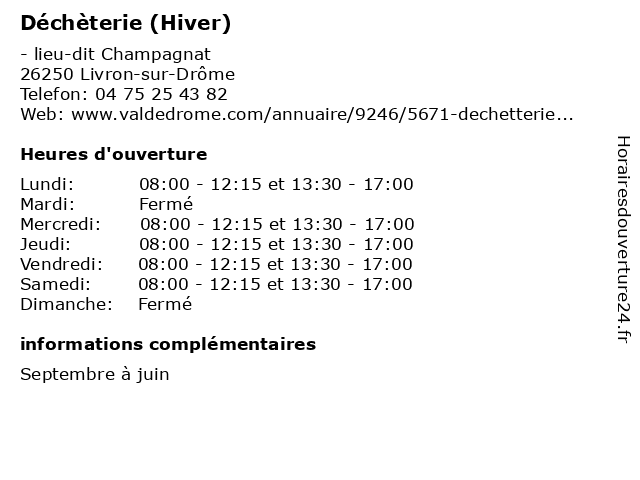 1 Déchèterie (Hiver) (Distance: 0,00 km) - lieu-dit Champagnat, 26250 Livron-sur-Drôme bennes, déchèterie, gravats, hiver, recyclage, tri 2 Déchèterie (Hiver) (Distance: 6,75 km) 135 chemin de Terre Glaise, 26270 Loriol-sur-Drôme bennes, déchèterie, gravats, hiver, recyclage, tri 3 Déchèterie (Hiver) (Distance: 14,33 km) - Quartier Brunelle, 26400 Eurre déchèterie, gravats, hiver, huiles usées, la réception des déchets et écocentres, les appareils électroménagers, les déchets verts, papier et carton en quantité 4 Déchèterie (d'été ) (Distance: 6,78 km) - Chemin, 26800 Étoile-sur-Rhône d'été, déchèterie, gravats, huiles usées, la réception des déchets et écocentres, les appareils électroménagers, les déchets verts, papier et carton en quantité 5 Déchèterie (hiver ) (Distance: 6,78 km) - Chemin, 26800 Étoile-sur-Rhône déchèterie, gravats, hiver, huiles usées, la réception des déchets et écocentres, les appareils électroménagers, les déchets verts, papier et carton en quantité 6 Déchèterie (Distance: 12,20 km) - Moriettes, 26760 Beaumont-lès-Valence déchèterie, gravats, huiles usées, la réception des déchets et écocentres, les appareils électroménagers, les déchets verts, papier et carton en quantité |