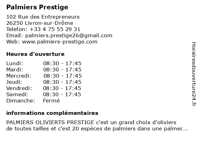 1 Paysages Prestige (Distance: 0,00 km) 102 Rue des Entrepreneurs, 26250 Livron-sur-Drôme paysages, prestige 2 L Etoile Prestige (Distance: 7,91 km) Zc n 17, 26800 Portes Les Valence etoile, prestige, restaurants 3 Christophe Diesel Services - CDIES - Prestige Animations (Distance: 8,75 km) 1060 Avenue du Président Salvador Allende, 26800 Portes-lès-Valence animations, cdies, christophe, diesel, prestige, services 4 My Beers (Distance: 21,64 km) n/a route de Chomérac, 07000 Privas beers, bieres, bieres de prestige, cave, my, specialiste 5 LS AUTO PRESTIGE (Distance: 27,87 km) 6 Allee De Barjac, 26200 Montelimar ad, auto, automobiles, concessionnaire, distribution, garage, ls, motos, prestige 6 Auto-école Prestige (Distance: 28,93 km) 2 Rue du Lycée, 07300 Tournon-sur-Rhône auto, prestige, école |