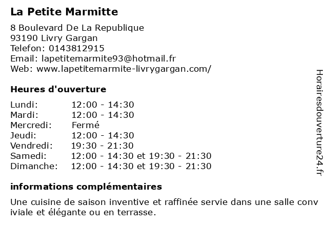 Termes de recherche pour La Petite Marmitte:restauration, restaurant, la, café, bar, petite, bistrot, brasserie, pub, resto, bistro, marmitte |