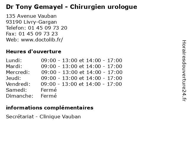 1 Dr Tony Gemayel - Chirurgien urologue (Distance: 13,75 km) 23 rue du Landy, 93400 Saint-Ouen chirurgien, consultation, docteur, dr, gemayel, med, médecin, médecine, tony, traitement, urologue 2 Dr Rachid Bahi - Chirurgien urologue (Distance: 0,00 km) 135 Avenue Vauban, 93190 Livry-Gargan bahi, chirurgien, consultation, docteur, dr, med, médecin, médecine, rachid, secrétariat, traitement, urologue 4 Dr. Tony Gemayel - Urologie (Consultation sur rendez-vous) (Distance: 1,15 km) 2 Bd Roy, 93320 Les Pavillions Sous Bois consultation, docteur, dr., gemayel, rendez, santé, sur, tony, urologie, vous 5 Dr. Tony Gemayel - Urologie (Consultation libre) (Distance: 1,15 km) 2 Bd Roy, 93320 Les Pavillions Sous Bois consultation, docteur, dr., gemayel, libre, santé, tony, urologie 6 Dr. Tony Gemayel - Urologie (Autre) (Distance: 1,15 km) 2 Bd Roy, 93320 Les Pavillions Sous Bois autre, consultation, docteur, dr., gemayel, santé, tony, urologie |