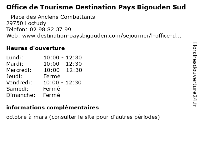 1 Office de Tourisme Destination Pays Bigouden Sud (Distance: 1,11 km) 5 rue du port, 29980 Île-Tudy bigouden, commune, de, destination, information, office, pays, renseignement, sud, tourisme, touristique, voyage 2 Office de Tourisme Destination Pays Bigouden Sud (Distance: 4,82 km) 9 rue du port, 29740 Plobannalec-Lesconil bigouden, commune, de, destination, information, office, pays, renseignement, sud, tourisme, touristique, voyage 3 Office de Tourisme Destination Pays Bigouden Sud (Distance: 4,97 km) 11 place Gambetta, 29120 Pont-l'Abbé bigouden, commune, de, destination, information, office, pays, renseignement, sud, tourisme, touristique, voyage 4 Office de Tourisme Destination Pays Bigouden Sud (Distance: 6,06 km) - Place Grafenhausen, 29120 Combrit bigouden, commune, de, destination, information, office, pays, renseignement, sud, tourisme, touristique, voyage 5 Office de Tourisme Destination Pays Bigouden Sud (Distance: 8,92 km) - Rue Men Crenn, 29730 Guilvinec bigouden, commune, de, destination, information, office, pays, renseignement, sud, tourisme, touristique, voyage 6 Office de Tourisme Destination Pays Bigouden Sud (Distance: 15,18 km) - Place Maréchal Davout, 29760 Penmarc'h bigouden, de, destination, horaires des musées, office, pays, restaurants, sud, tourisme, transports |