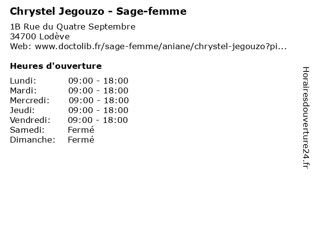 | 1 Chrystel Jegouzo - Sage-femme (Distance: 22,07 km) 44 Lotissement du Camp de Sauve, 34150 Aniane chrystel, femme, jegouzo, sage, sagefemme, sante 2 Dr Chrystel Constans - Radiologue (Distance: 47,34 km) 50 Rue Emile Combes, 34170 Castelnau-le-Lez chrystel, constans, consultation, docteur, dr, med, médecin, radiologue, traitement 3 Sabrina Trebosc - Sage-femme (Distance: 0,01 km) 1bis Rue du Quatre Septembre, 34700 Lodève femme, sabrina, sage, sagefemme, sante, trebosc 4 Dr Elodie Legros - Psychiatre (Distance: 0,01 km) 1 bis Rue du 4 Septembre, 34700 Lodève dr, elodie, legros, psy, psychiatre, sante, soins 5 Véronique Schertz - Sage-femme (Distance: 15,53 km) 41 Avenue Raymond Lacombe, 34800 Clermont-l'Hérault femme, medical, sage, sagefemme, schertz, véronique 6 Justine Mazel - Sage-femme (Distance: 32,13 km) 20 mail Georges Sand, 34570 Montarnaud femme, justine, mazel, medical, sage, sagefemme |
