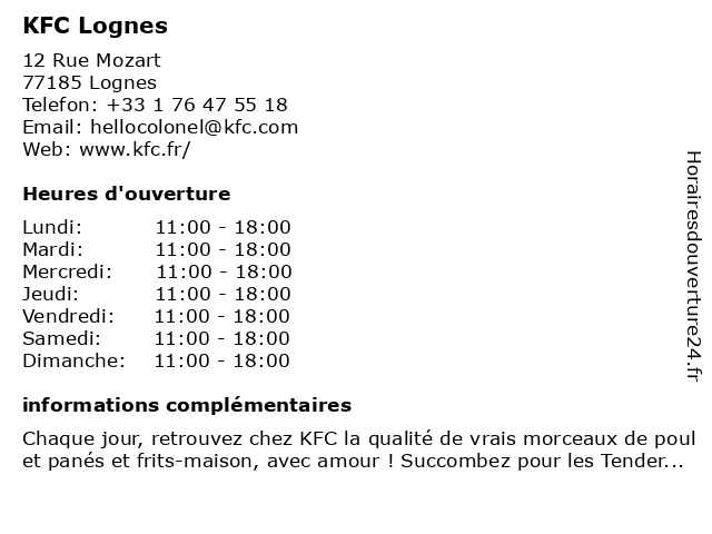 1 KFC Lognes (Distance: 0,01 km) 12 Rue Wolfgang Amadeus Mozart, 77185 Lognes burgers et buckets, frites, kfc, lognes, poulet et bucket, restaurant 2 KFC Drive (Distance: 0,00 km) 12 Rue Mozart, 77185 Lognes boissons, burger, drive, fastfood, frites, kfc, restaurant 4 KFC Villiers-sur-Marne (Distance: 6,91 km) 2 Boulevard Jean Monnet, 94350 Villiers-sur-Marne kfc, marne, sur, villiers 5 Kfc France Sas (Distance: 7,20 km) Zac De La Port De Villiers, 94354 Villiers Sur Marne Cedex france, kfc, restaurants 6 |