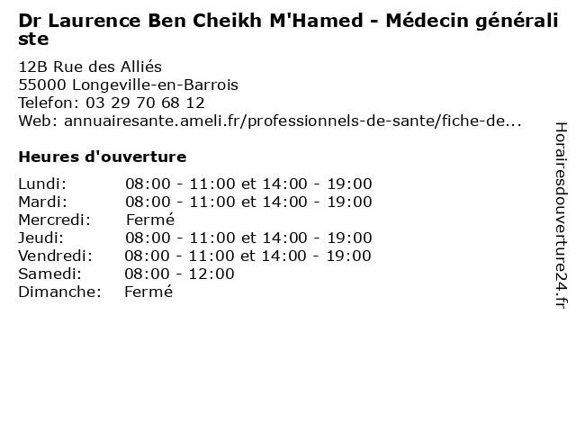 | Lundi | 08:00-11:00 et 14:00-19:00 |