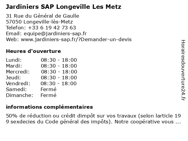 2 Jardiniers SAP Delme (Distance: 31,87 km) 60 Rue du Général Nassoy, 57590 Delme delme, jardiniers, sap 3 Jardiniers SAP Menil La Tour (Distance: 43,21 km) 16 Rue de Verdun, 54200 Ménil-la-Tour jardiniers, la, menil, sap, tour 5 Jardiniers SAP Geville (Distance: 49,99 km) 2 Rue Mademoiselle de Vauzelle, 55200 Geville geville, jardiniers, sap 6 Jardiniers SAP Varangeville (Distance: 54,75 km) 27 Rue du Colonel Fabien, 54110 Varangéville jardiniers, sap, varangeville |